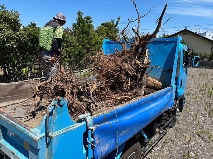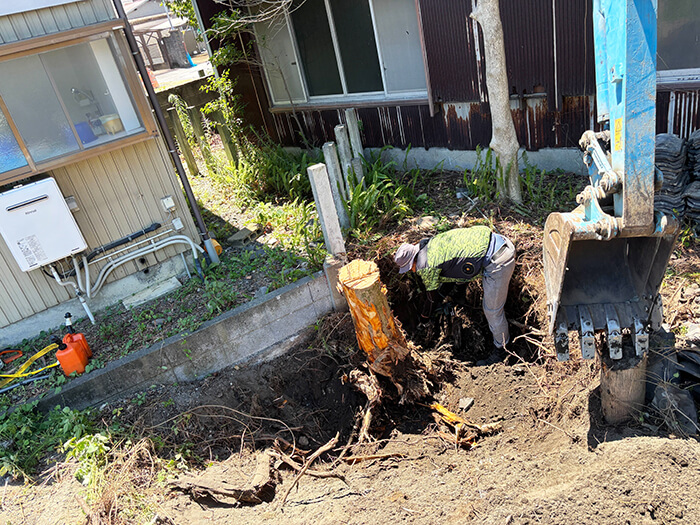 伐採後に残った根が土地の境界部分にかかっており、見た目の問題だけでなく、今後の整地や活用にも支障が出る可能性がある状況でした。境界がはっきりするよう、根までしっかり撤去してほしいとのご要望でした。